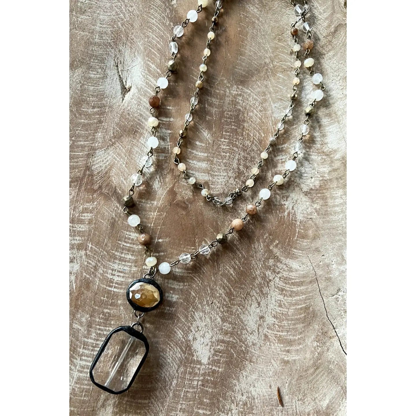 Sparkle and shine with this delightful double-layer chain link necklace featuring beads in various sizes and two stunning crystal pendants—one oval and one rectangular—that catch the light beautifully. The shorter 7-inch strand pairs perfectly with the longer 8.5-inch strand for a total length of 11 inches, creating lovely dimension right at your neckline. Each pendant drops 2 inches for maximum sparkle and movement. An adjustable lobster claw closure ensures a comfortable, customizable fit. The Dylan Designs Micah Necklace in Bronze Taupe brings playful elegance and crystalline beauty to any outfit—short, sweet, and seriously stylish!