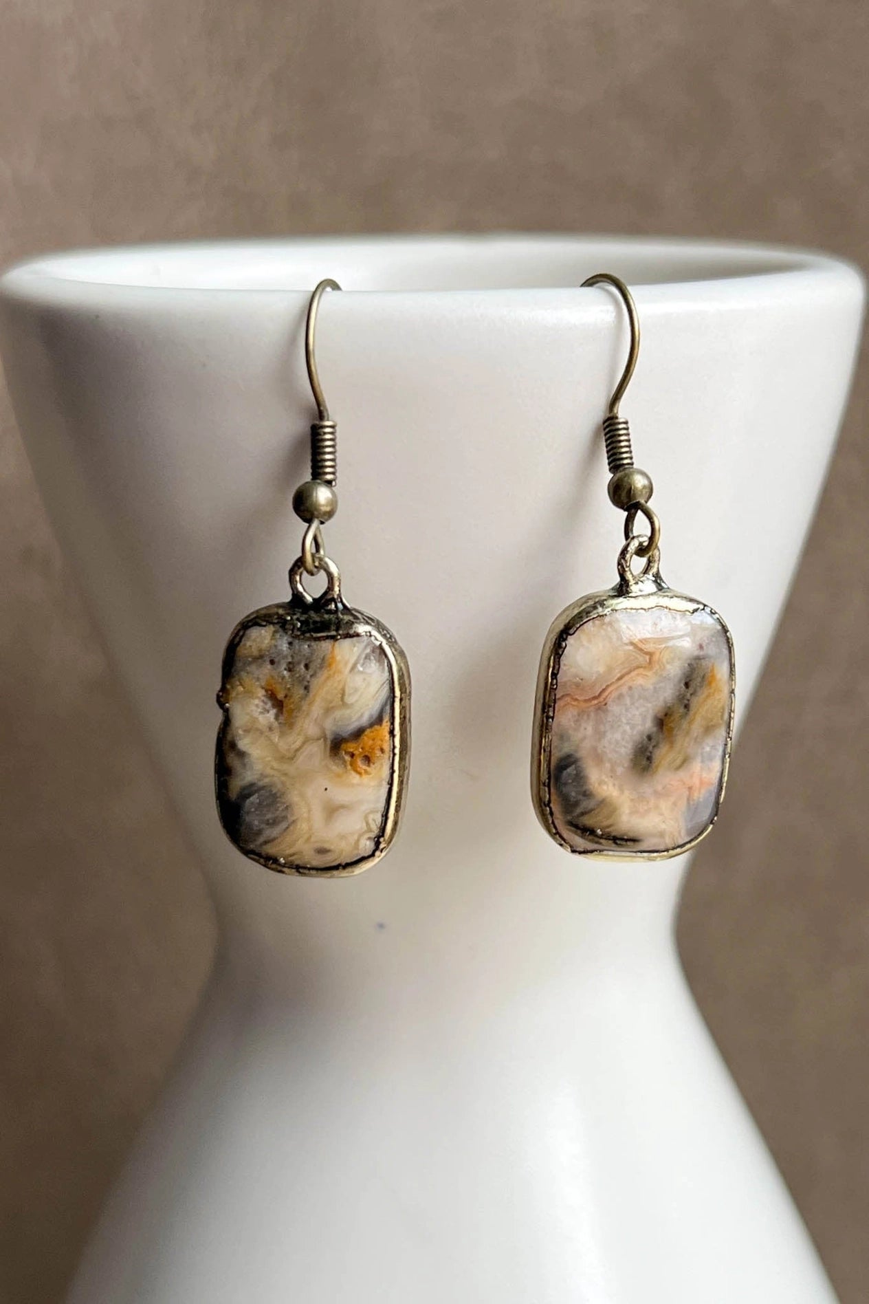 Add a splash of natural intrigue with these delightful fishhook earrings featuring petite bronze soldered rectangles showcasing the mesmerizing patterns of genuine stone. Measuring just 1.25 inches, they're perfectly sized for everyday wear or mixing and matching with other pieces in your collection. The beauty of working with natural materials means no two pairs are exactly alike—your Dylan Designs Sicily Earrings in Crazy Agate will have their own distinctive personality with unique color and texture variations. Effortless style that celebrates the quirky, wonderful imperfections of nature.