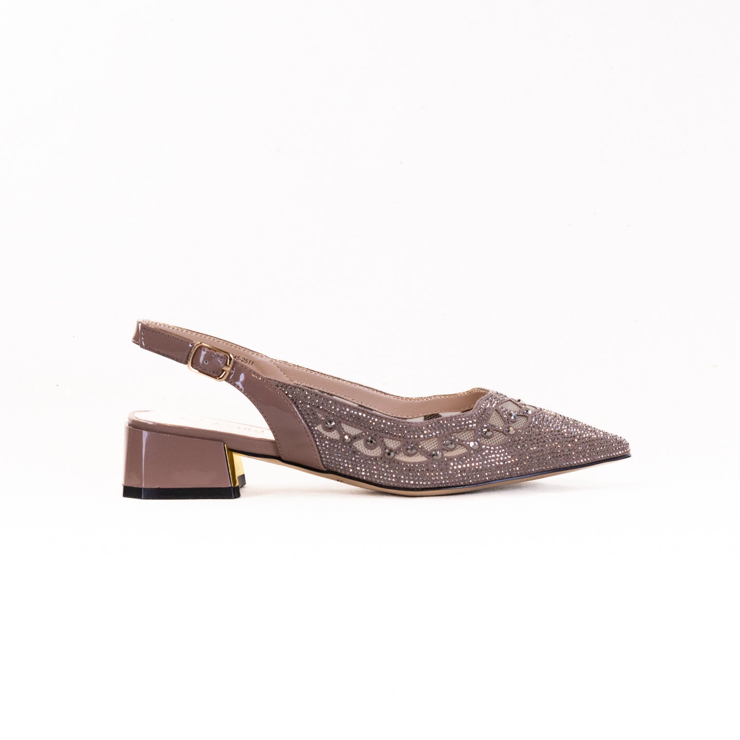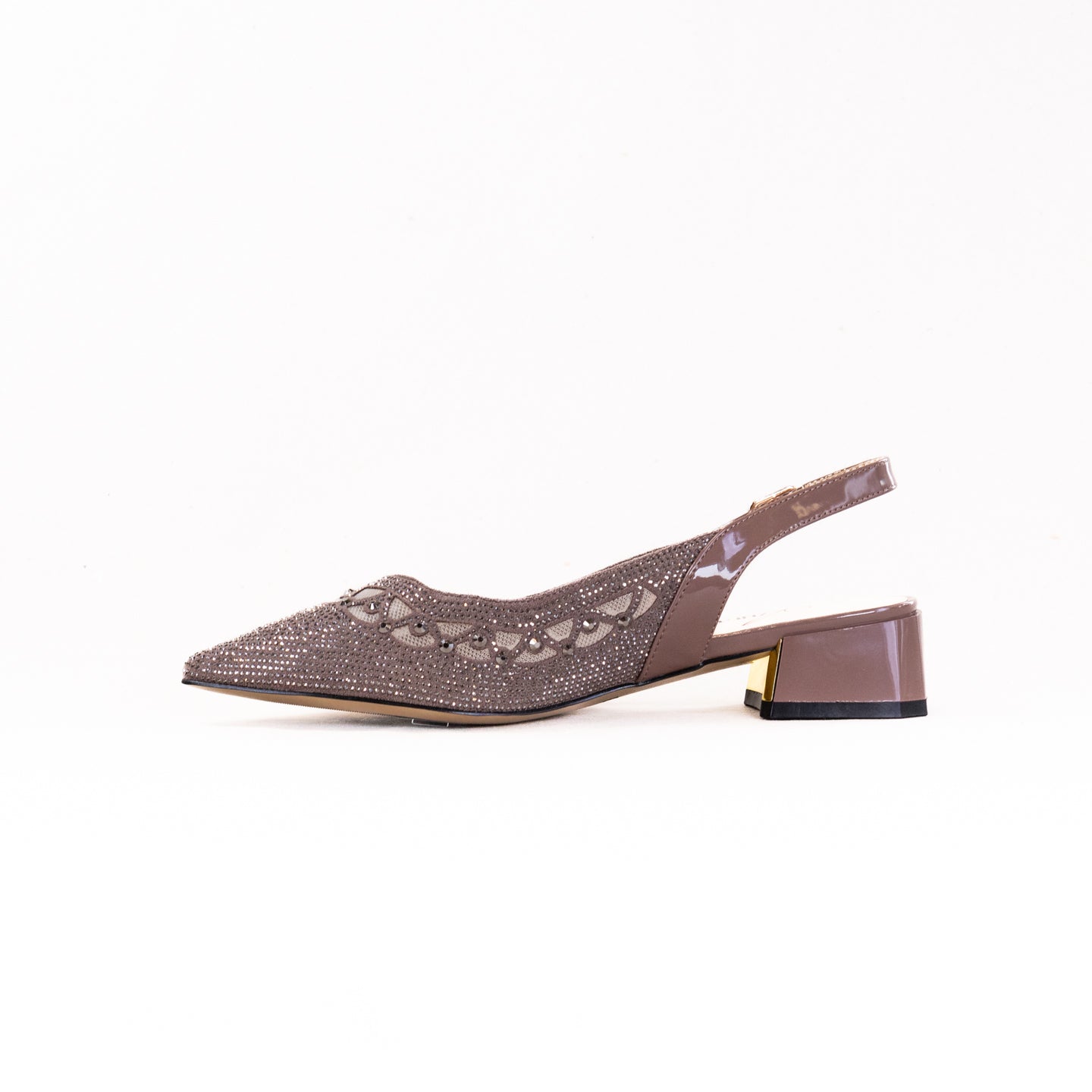 Step into timeless sophistication with this simply elegant slingback pump that exudes refined glamour from every angle. Designed with a sheer mesh underlay and adorned with sparkling embellishments, this style blends classic femininity with modern allure. The scalloped detailing with shimmering crystals creates a delicate yet captivating look, while the low block heel offers the perfect balance of poise and comfort. Finished with a sleek adjustable strap and a touch of metallic accent at the heel, this shoe is the epitome of understated luxury — versatile enough for a polished daytime look yet dazzling enough to elevate any evening ensemble.