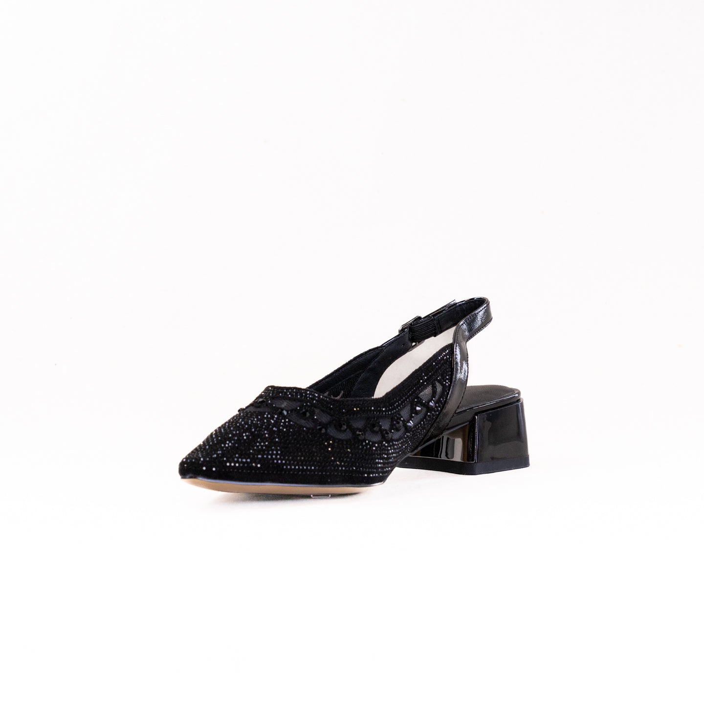 Step into timeless sophistication with this simply elegant slingback pump that exudes refined glamour from every angle. Designed with a sheer mesh underlay and adorned with sparkling embellishments, this style blends classic femininity with modern allure. The scalloped detailing with shimmering crystals creates a delicate yet captivating look, while the low block heel offers the perfect balance of poise and comfort. Finished with a sleek adjustable strap and a touch of metallic accent at the heel, this shoe is the epitome of understated luxury — versatile enough for a polished daytime look yet dazzling enough to elevate any evening ensemble.