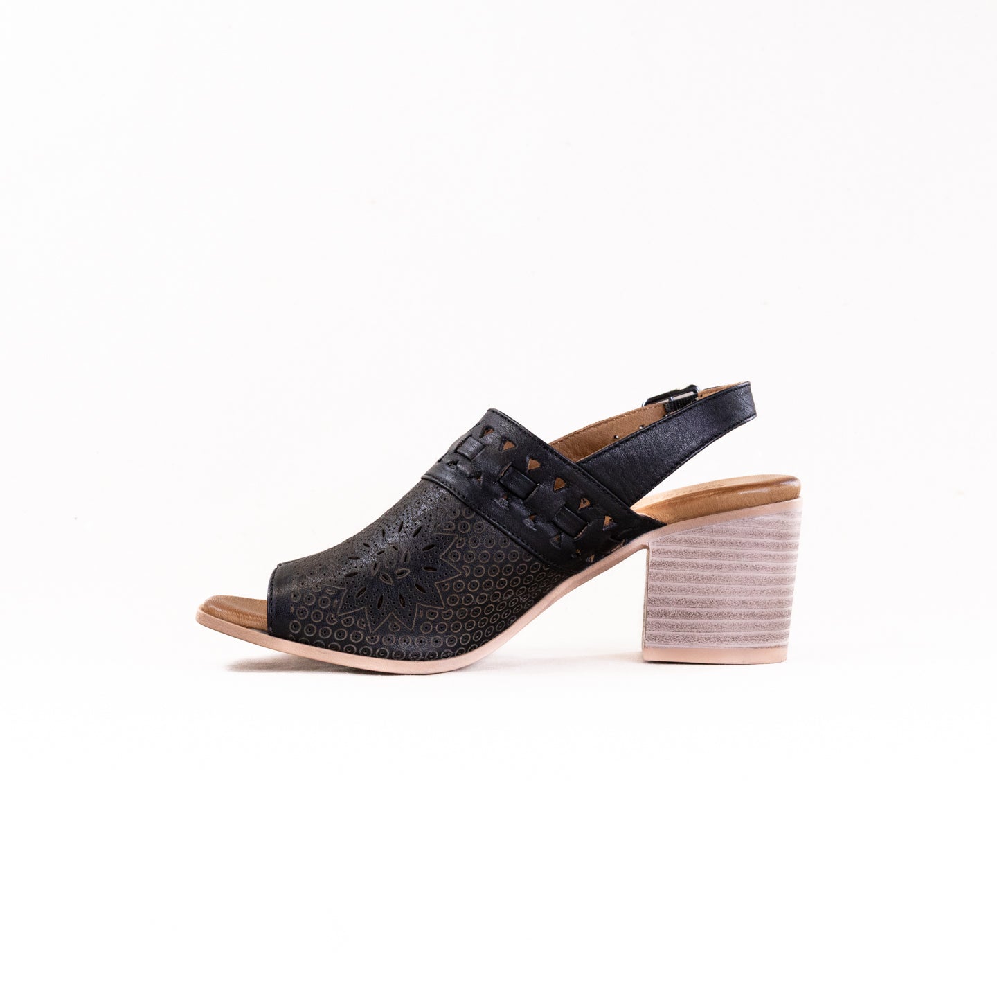A chic update to the everyday sandal, this design fuses contemporary laser artistry with structured comfort. The bold cutout pattern radiates across the leather upper like modern geometric lace, accented by a woven leather strap detail that adds subtle texture. Finished with a squared toe shape, this sandal brings architectural balance to its faux-stacked block heel, delivering the perfect blend of height and walkable stability. Effortless with cropped denim, tailored jumpsuits, or flowy culottes, this versatile sandal is a modern wardrobe essential that carries you confidently from daytime chic to after-hours polish.